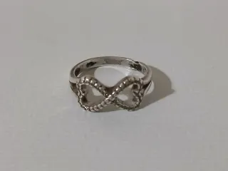 Anillo con diseño de infinito entrelazado con corazones. - Fabricado en plata de ley. - Detalles de pequeñas circonitas incrustadas. No envio. Entrego en mano en Humanes de Madrid.