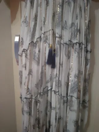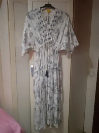 Elegante vestido largo con un estampado sutil y detalles brillantes. Perfecto para ocasiones especiales. - Diseño con escote en V adornado con pequeñas flores azules. - Cintura ajustable con cordón. - Mangas cortas tipo mariposa. - Falda con varios volantes. - Tejido ligero con hilos dorados. No envio. Entrego en mano en Humanes de Madrid.