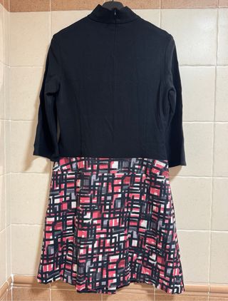 Vestido de la marca Trucco que simula ser de dos piezas. Presenta un diseño con cuello alto y manga tres cuartos acampanada en la parte superior, y una falda con estampado geométrico. - Estampado de cuadros en tonos rojo, negro y gris. - Detalle de cinturón en la cintura con hebilla y botones. Medidas: Largo 1 metro, cintura baja 43 cms, Pecho 47 cms, hombro 38-39 cms. Composición parte superior 97% Algodón 3% Elastano, parte inferior 70% Poliéster 26% Nylon 4% Elastano. Forro 100% poliéster. En Perfecto Estado.