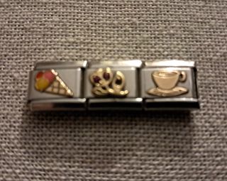 Conjunto de tres charms para pulsera. - Charm con forma de cono de helado. - Charm con forma de flor. - Charm con forma de taza de café.