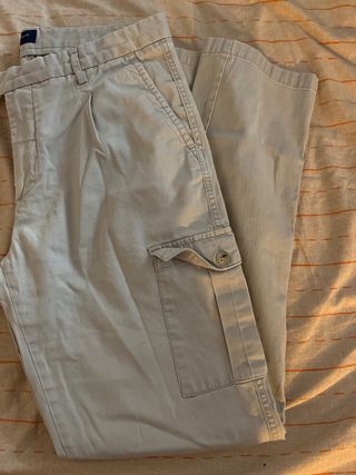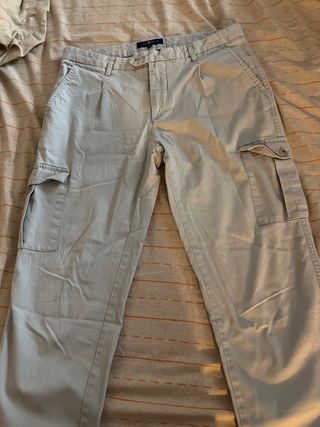 Pantalón de vestir de corte clásico. - Diseño con pinzas delanteras. - Bolsillos laterales. - Bolsillos de cargo con solapa y botón.