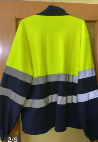 Chaqueta de trabajo con bandas reflectantes para alta visibilidad. - Color principal amarillo fluorescente. - Mangas y parte inferior en azul marino. - Cuello alto. - Cierre de cremallera frontal. Está nueva solo una manga un poco quemada última foto ni se ve