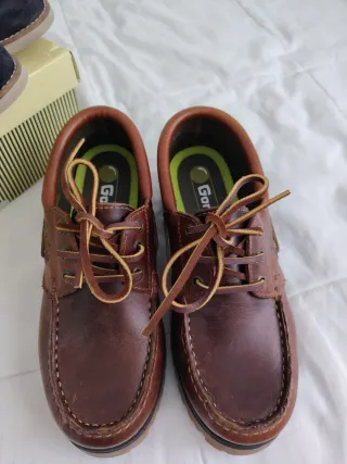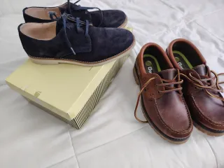2x50€ Par de zapatos de vestir y náuticos. - Zapatos de ante azul con cordones. - Zapatos náuticos de piel marrón con cordones.