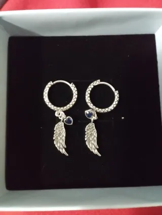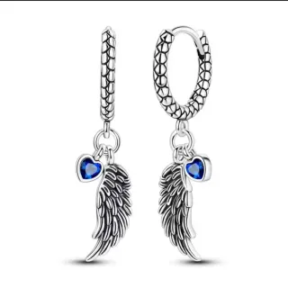Elegantes pendientes de plata 925 con diseño de alas y un detalle de corazón azul. - Material: Plata de ley 925. - Diseño: Alas detalladas con corazón azul. - Cierre: Aro.