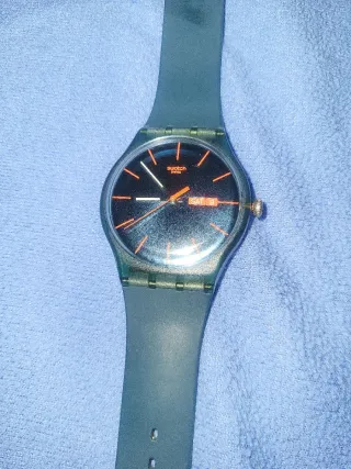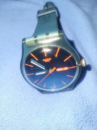 Reloj de pulsera de la marca Swatch con un diseño moderno y llamativo. - Esfera azul. - Detalles en rojo - Correa de goma. Desconosco si funciona