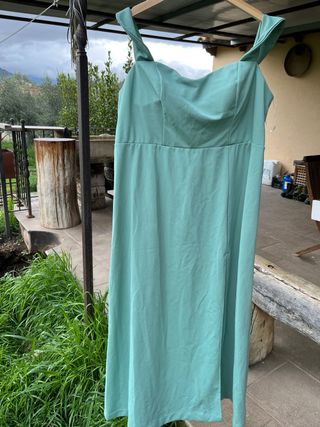 Vestido largo de tirantes caidos por el hombros, ideal para eventos especiales. - Diseño elegante con escote. - Abertura lateral en la falda. - Tejido suave y fluido. -Color aguamarina.