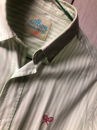 Camisa de manga larga con un diseño de rayas verticales en tonos verdes y blancos. Presenta un pequeño bordado de una raqueta de tenis en el pecho. - Cuello abotonado. - Cierre de botones. - Puños con botón.