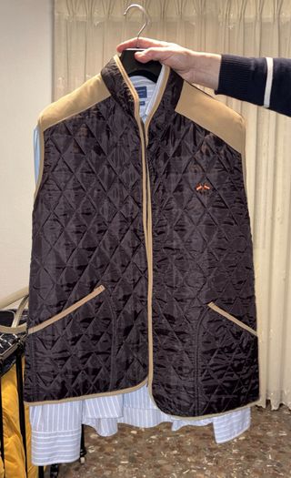 Chaleco de color beige, ideal para actividades al aire libre o trabajo . - Cierre frontal con cremallera. - Bolsillos con cremallera. - Cuello alto. - Reversible
