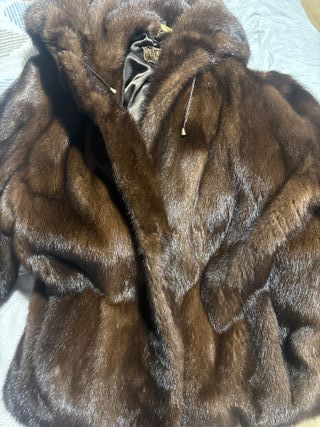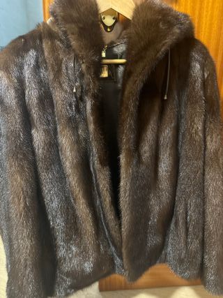 Abrigo de piel auténtica con un diseño elegante y moderno. Ha sido muy poco usado y se encuentra en excelentes condiciones. - Piel auténtica de alta calidad. - Diseño con capucha. - Cierre frontal con botones.