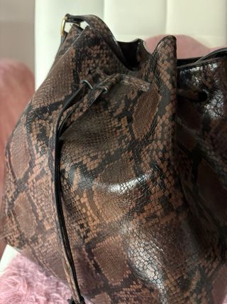 Bolso de mano con un llamativo estampado de serpiente. - Diseño tipo saco. - Cierre con cordón. - Asa de bandolera. - Detalle de herrajes dorados.