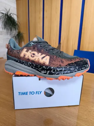 Zapatillas Hoka Speedgoat 6 en tonos verdes y naranjas. - Diseño con estampado. - Suela Vibram.