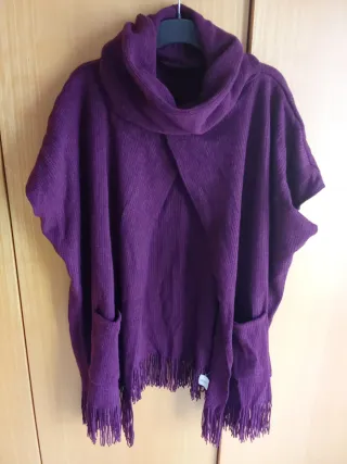 Poncho de punto grueso con un diseño moderno y cómodo. En color granate oscuro. Envío - Cuello alto tipo bufanda. - Dos bolsillos delanteros. - Detalle de flecos en el bajo. - Tejido acanalado.