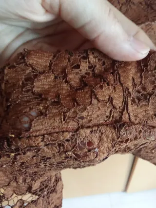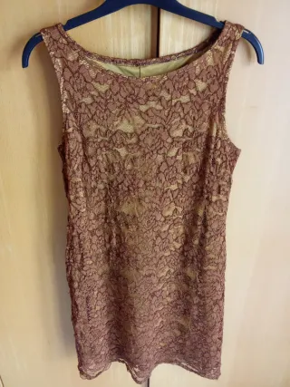Elegante vestido de encaje con un bonito diseño en color marrón y dorado. Hecho en España. Envío - Tejido de encaje intrincado. - Forro interior. - Diseño sin mangas.