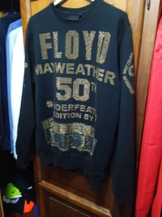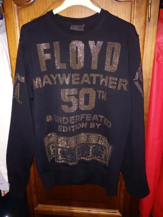 Sudadera negra con detalles dorados brillantes. - Diseño con texto Floyd Mayweather 50th. - Acabado con pedrería dorada. - Mangas con detalles. - Cuello redondo.