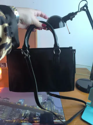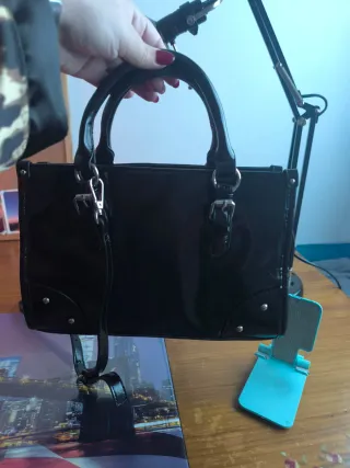 Bolso de mano con acabado brillante. - Asa superior. - Cierre con hebilla. - Correa desmontable.