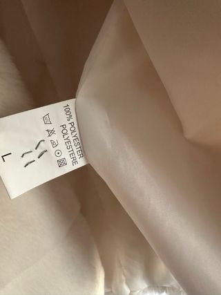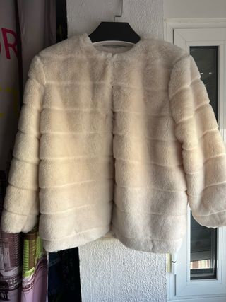 Abrigo de pelito sintético en color beige, talla L. Está como nueva. - Diseño de peluche suave. - Corte recto y moderno. - Cierre frontal.