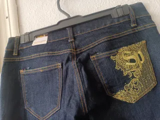 Pantalón vaquero de mujer con un diseño moderno y detalles bordados. - Bordado dorado en los bolsillos delanteros. - Costuras en contraste. - Corte ajustado.