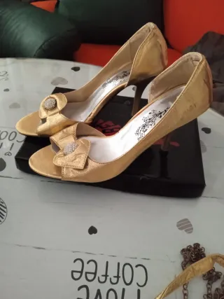 Elegante conjunto de zapatos de tacón y bolso de mano. - Zapatos de tacón abierto en color dorado. - Adorno de pedrería en la pala del zapato. - Bolso de mano tipo sobre en color dorado. - Cierre con botón joya en el bolso.
