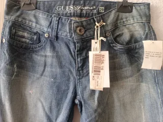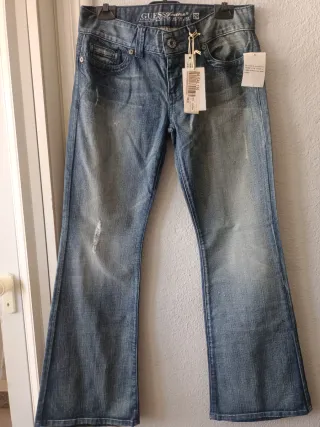 Pantalón vaquero de corte acampanado de la marca Guess. - Diseño desgastado. - Detalle de rotos. - Cierre de cremallera y botón.