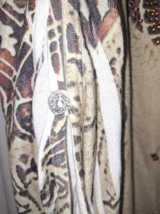 Bonita camisa con un diseño llamativo, ideal para fiestas o eventos especiales. - Estampado animal print en tonos marrones. - Detalles brillantes en los laterales. - Diseño fluido y elegante.