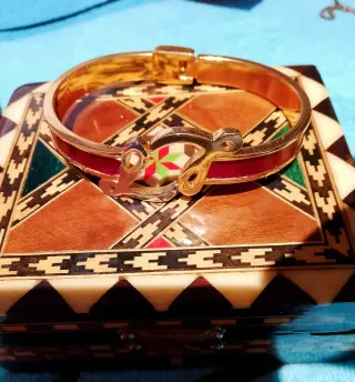 Elegante pulsera o brazalete de la marca Loewe. Loewe es nuestra marca española de lujo con mayor valor a nivel internacional. Loewe representa la fortaleza del sector de lujo en España casd fundada en Madrid y demuestra su gran capacidad para escalar posiciones en el ranking de las marcas de lujo más valiosas del mundo. - Diseño con detalles dorados y banda en color rojo. - Cierre de clip. Vintage mui valorada aceptamos pagos wallapop y envíamos método inpost