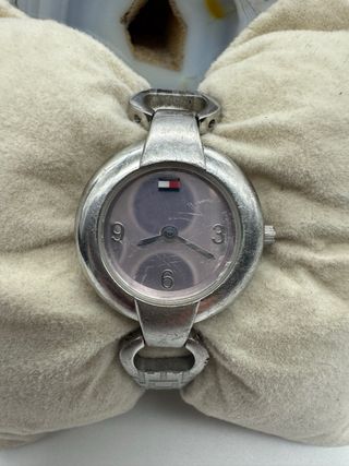 Elegante reloj de pulsera con un diseño moderno. - Esfera en tono rosa pálido. - Brazalete de eslabones en color plateado. - Detalle del logo de Tommy Hilfiger en la esfera. -Funciona perfectamente.