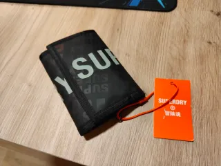 Cartera de la marca Superdry con un diseño moderno y llamativo. - Estampado repetido de la marca. - Cierre de velcro. - Incluye etiqueta original.