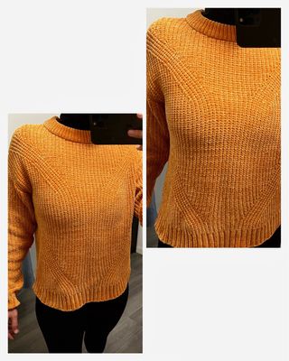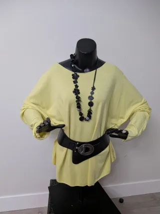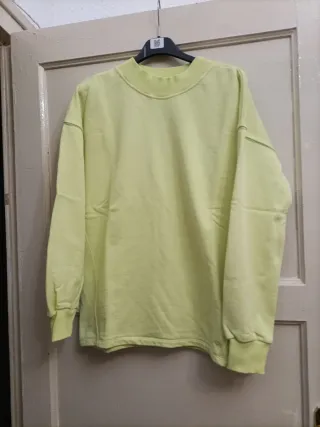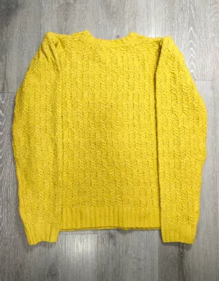 Jersey de punto grueso en color amarillo vibrante. Diseño moderno con cuello redondo, manga larga y aperturas laterales - Tejido de punto acanalado. - Bajo con aberturas laterales. - Corte holgado. - Talla XL Nuevo sin usar y sin etiquetas