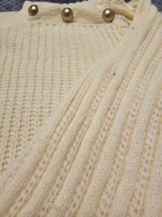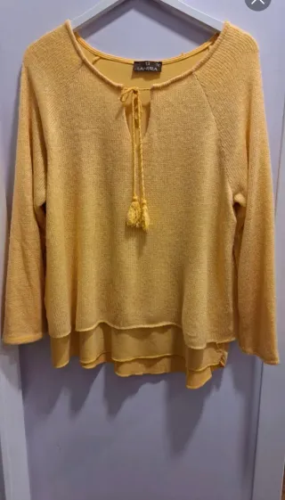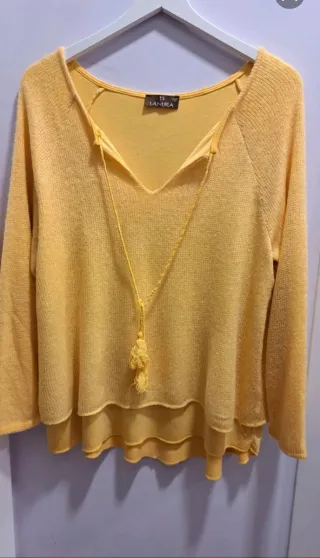 Jersey de punto con un diseño moderno y cómodo. Sin uso. - Manga larga. - Escote con lazada y detalle de flecos. - Doble capa inferior. Entra en mi perfil!! Artículos buenos a buen precio.