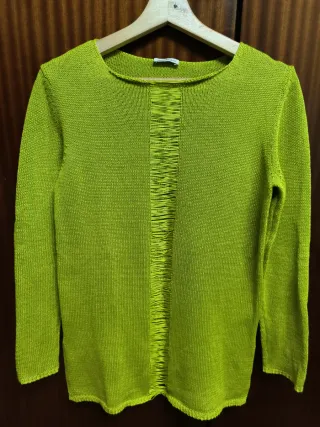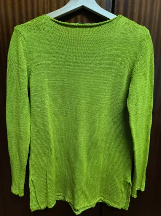Jersey de punto fino con un diseño moderno y llamativo. Talla S y M - Cuello redondo. - Manga larga. - Detalle de aberturas verticales en el frente.