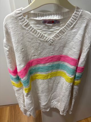 Jersey de manga larga con cuello en pico y detalles de rayas de colores. - Diseño de rayas en rosa, turquesa y amarillo. - Tejido ligero y cómodo. Talla 10. 140cm