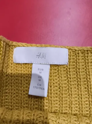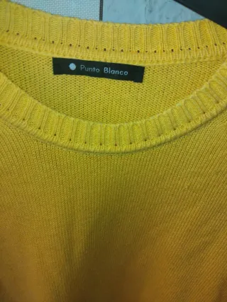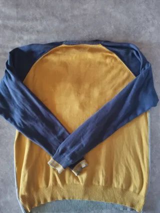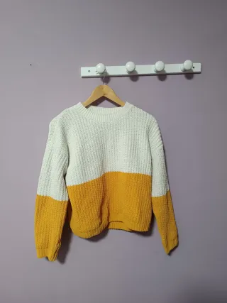 Jersey de punto con un diseño moderno de bloques de color. - Parte superior blanca. - Sección inferior en amarillo mostaza. - Detalle en color marrón. - Manga larga. -Precio negociable💰 -Preguntar sin compromiso✅ -Envío rápido y seguro📦