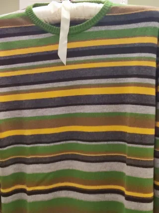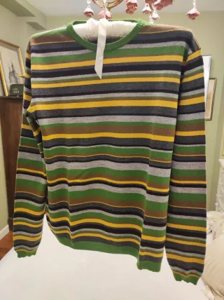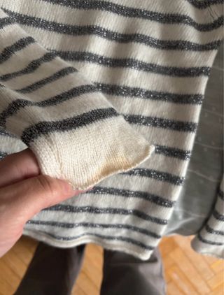 Jersey de punto con rayas finas. Un básico versátil para cualquier ocasión. - Diseño de rayas horizontales con brillito gris. - Cuello redondo. - Talla M, pero va bastante ajustado, como si fuera S incluso XS - Lana Tiene una mancha amarilla en la manga, no sé de qué es... de ahí su precio. Me costó 27,99€, lo he usado 2 veces.