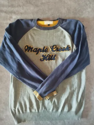 Jersey de punto con diseño tipo raglán y el texto Maple Creek Hill bordado en el pecho. Ideal para un estilo casual. - Mangas de color azul marino. - Cuerpo principal en gris claro. - Cuello redondo con detalle amarillo en el interior. - Puños y bajo acanalados.