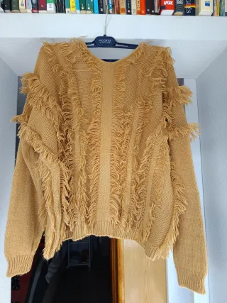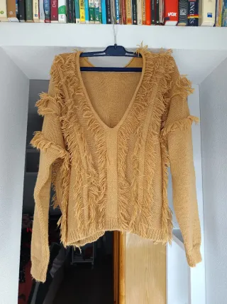Jersey de punto con un diseño original y moderno, perfecto para añadir un toque especial a tu armario. - Color amarillo mostaza. - Adornado con flecos en mangas y delantero. - Cuello en pico.
