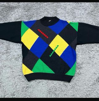 Jersey con un llamativo diseño colorblock. - Mangas y cuello negros. - Patrón de rombos en amarillo, azul y verde. - Detalles geométricos en rojo y verde.
