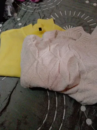 Se vende lote de 4 Suéteres de punto en colores. - Un jersey de punto amarillo mostaza marca Only, más corto por delante. - Un jersey de punto gris corto con diseño de estrella talla XS - Un jersey de punto azul degradado de marca Green Coast talla S. - Una sudadera ligera con bloques de color. Se lleva a casa si es Zaragoza o alrededores
