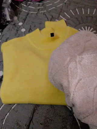 Conjunto de tres jerséis de punto para mujer. Todo por 5€ - Jersey amarillo de cuello alto. - Jersey beige de canalé. - Jersey azul y verde con degradado.