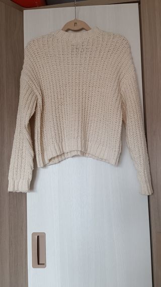 Se vende Jersey de punto de Bershka, color blanco rosaceo, de la talla M, muy calentito y pegado al cuerpo. Si se necesitan más fotos, ponerse en contacto conmigo. Más prendas de ropa en mi perfil.