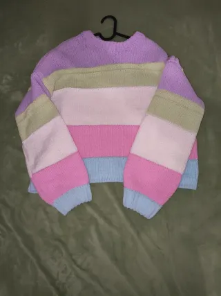 Jersey de punto con un diseño de rayas vibrantes. Es una prenda llamativa y cómoda. - Diseño de rayas horizontales. - Cuello redondo. - Manga larga. - Medidas 65 cm de ancho y 36 cm de largo