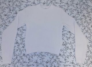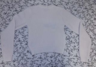 Jersey acrílico de la marca Bershka en color blanco óptico. Se encuentra en buen estado. Pone que es talla XS pero en realidad da hasta una M. Mejor ver medidas en fotos. - Tejido suave y ligero. - Cuello redondo. - Manga larga.