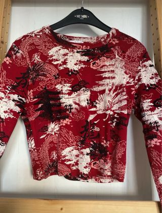 Jersey de Bershka con un diseño inspirado en el estilo japonés. - Manga larga. - Estampado llamativo en tonos rojos, blancos y negros. - Corte cropped.