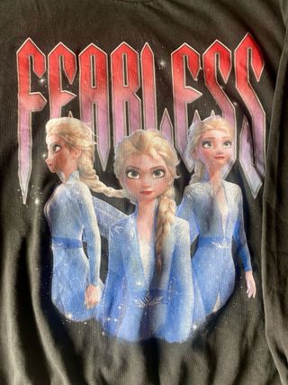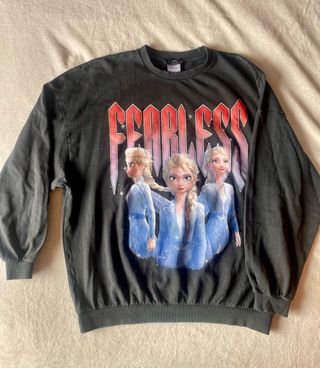 Jersey o Sudadera fina de Elsa (Frozen II - Disney) color Gris Oscuro. Talla: XS Muy Oversize Medidas: Largo 68cm x 63cm Ancho Letras Fearless delante. SOLO ENVIO. PROTECCION TOTAL.