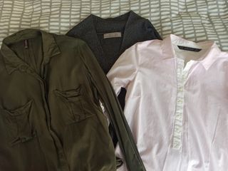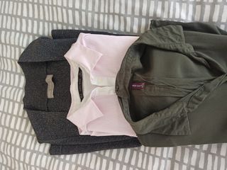 camisa de Bershka verde caqui. manga larga. camisa de Zara rosa palo. manga tres cuartos. jersey fino gris plateado de Zara. manga tres cuartos. talla M.