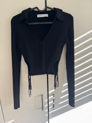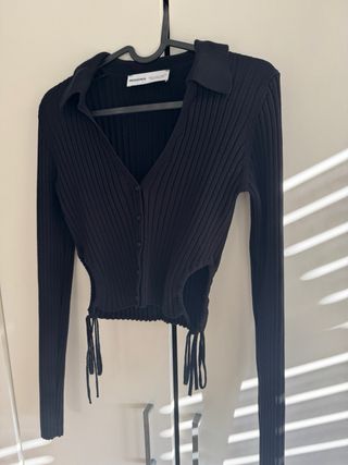 Jersey de punto fino con cuello camisero y botones. - Diseño acanalado. - Aberturas laterales con cordones. - Manga larga.