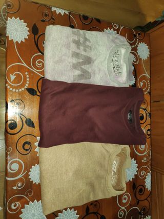 Conjunto de cuatro prendas de ropa todas de la talla L Todo el lote por solo 15 € Compuesto por: - Jersey verde con capucha y rayas finas. De Bershka - Camiseta de manga larga a rayas azul verdoso de h&m - Blusa estampada multicolor con escote de Stradivarius - Camiseta beige con detalles bordados y escote.
