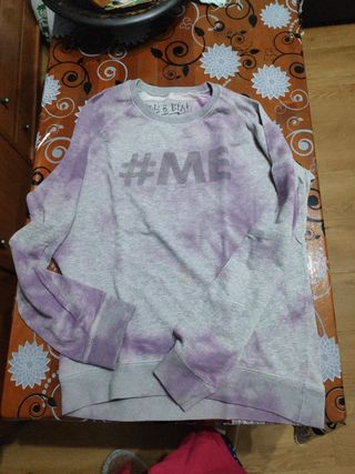 Lote de 3 jerséis de chico: - sudadera de Pull & bear, gris hace aguas moradas y letras en gris, talla M -jersey de Bershka, morado largo, linea recta y aberturas en los costados del bajo con cremalleras, talla M -jersey de Pull & bear, color marrón clarito o beige, detalles en los hombros de cosidos en forma de rombos, talla M