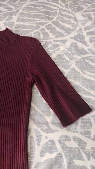 Preciosa camiseta de canalé color granate, talla L.Es de manga tres cuartos y tiene un cuello alto con cremallera. Está en muy buen estado. Es ajustado, por lo que sirve para otra talla,. - Cuello alto - Cremallera frontal - Manga tres cuartos