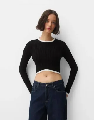 Jersey de canalé con cuello redondo y manga larga. Un básico versátil para tu armario. - Diseño cropped. - Ribetes en contraste.