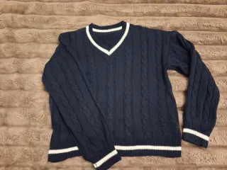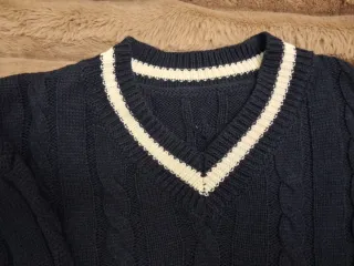 Jersey de punto clásico con diseño de ochos o trenzado, ideal para un estilo "preppy" o universitario que nunca pasa de moda. Estilo/corte: Cuello en pico (V) resaltado con franjas blancas a contraste, detalle que se repite en los puños y el bajo del jersey. Manga larga y tejido con relieve trenzado en todo el cuerpo y mangas. Talla: Talla única (equivale aproximadamente a una M/L por su corte relajado). Medidas aprox.: Largo 62 cm, Pecho 54 cm. Estado: Muy buen estado. El punto está bien cuidado, sin enganches ni pérdida de forma en los elásticos. #jersey #azulmarino #preppy #estilouniversitario #punto #knittedsweater #navyblu